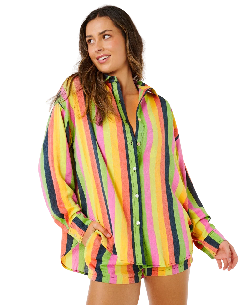 Blending Rip Curl’s surf heritage with FARM Rio’s signature prints, the Womens Neon Stripe Relaxed Shirt in Multi brings bold, print-led style to a lightweight, easy-wearing staple.